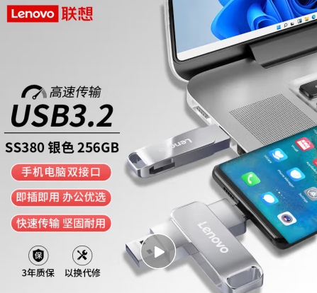 联想(Lenovo) SS380256G 手机U盘 Type-C USB3.2 双接口旋转优盘 金属耐用 商务办公必备 SS380系列银色