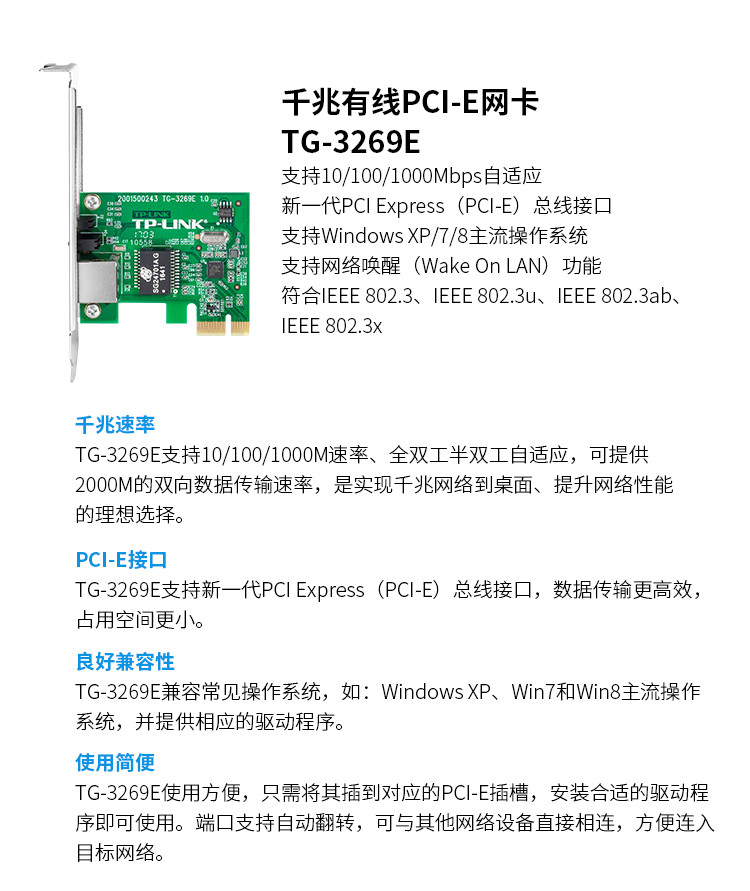 普联(TP-LINK) TG-3269E 千兆有线PCI-E网卡 内置有线网卡 千兆网口扩展 台式电脑自适应以太网卡