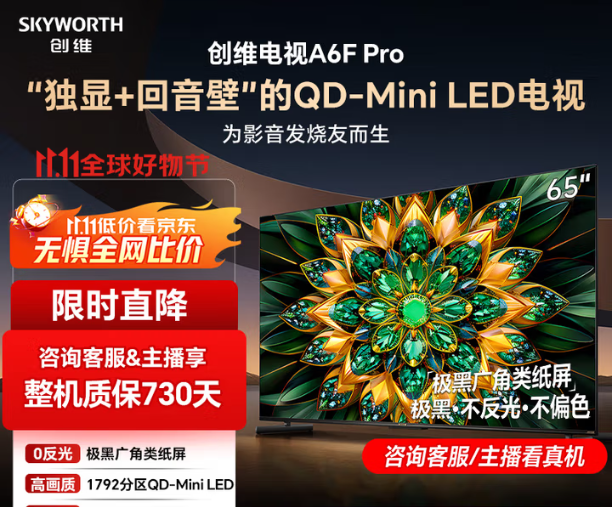 创维(Skyworth) 65A6F Pro 65英寸智能平板电视机1792分区QD-Mini LED 回音壁液晶游戏