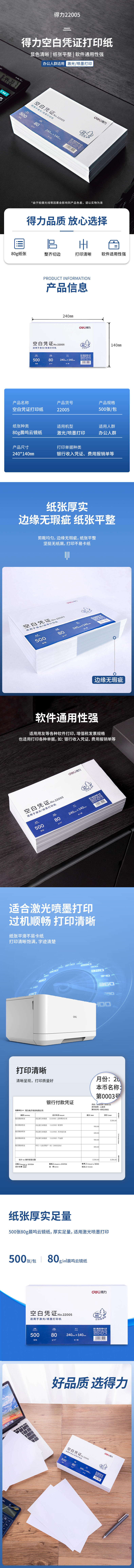 得力(deli) 80g晨鸣云镜空白单据凭证纸 适用于用友金蝶财务软件记账凭证打印纸 240*140mm 500张 22005