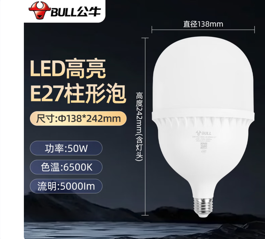 公牛(BULL) LED灯泡高亮球泡柱形灯厂房车间商超过道照明灯 MQ-C050C-AS E27螺口50W白光6500K